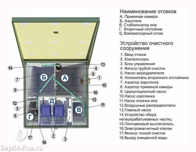 Наименование отсеков септика ТОПАС 5: